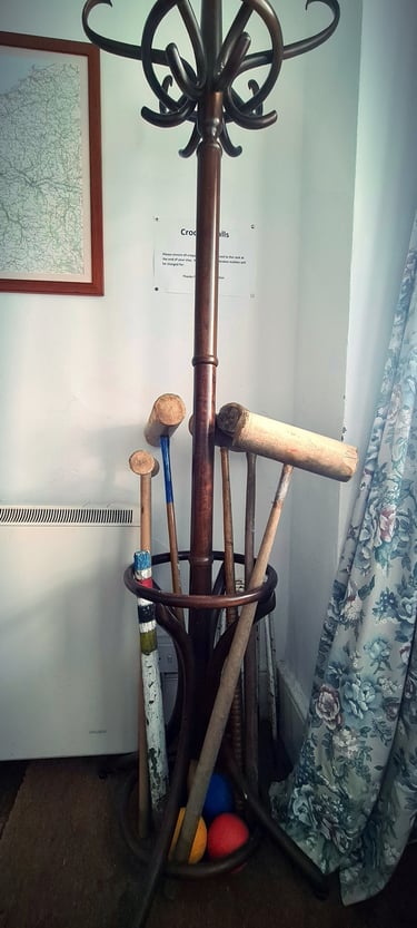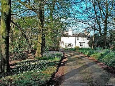 Gardens with seating, wooded driveway and croquet lawn